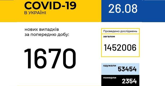 Сьогодні, 26 серпня, у прес-службі МОЗ повідомили, що за минулу добу в країні виявили 1670 нових випадків захворювання на коронавірус. За весь період в Україні лабораторно підтвердили 110 085 випадків захворювання. З них 2354 летальні випадки.