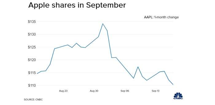 За даними видання CNBC, з 2 вересня поточного року акції компанії Apple подешевшали на 22,5%. Американській технологічний гігант втратив близько 532 мільярдів доларів в ринковій вартості.