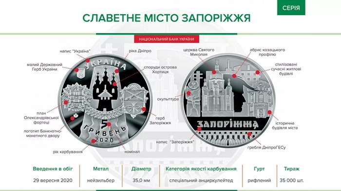 В пресс-службе НБУ сообщили, что в Украине появится новая памятная монета номиналом 5 гривен. Она будет называться «Славный город Запорожье». В Нацбанке заявили, что Запорожье – «один из крупнейших административных, индустриальных и культурных центров юга Украины, где гармонично сочетаются природа, промышленные гиганты и разнообразие архитектуры».