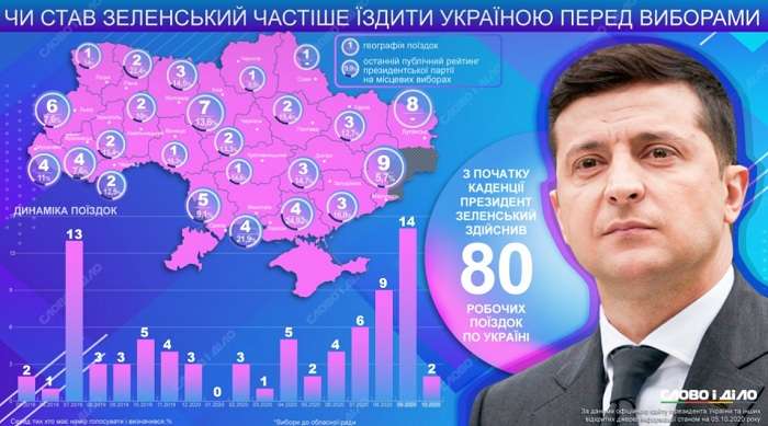 «С начала каденции президент в среднем совершал 3 поездки по стране в месяц. Исключением стали июля 2019 года (13 поездок), октябрь 2019 го (5), апрель 2020 го (5 визитов). В сентябре 2020 Зеленский сделал целых 14 поездок. В январе текущего года Зеленский вообще не ездил по стране», – говорится в сообщении.