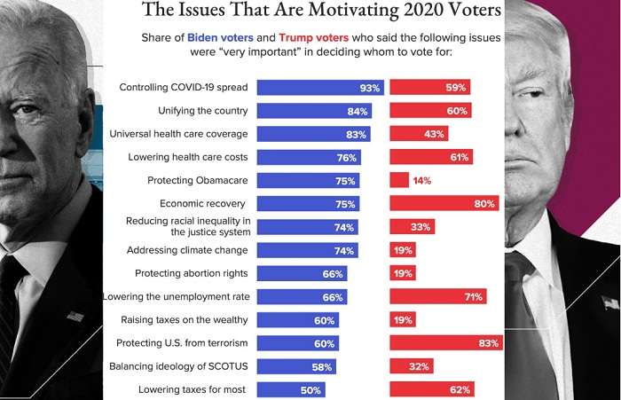 Тим часом 93% демократичних виборців найбільше хвилює боротьба з коронавірусом, 84% – єдність американського суспільства, 83% – універсальна охорона здоров’я. Разом з тим їх не хвилює скорочення імміграції (13%), будівництво стіни (7%), усунення Obamacare (15%) і підвищення інвестицій в державу (16%).