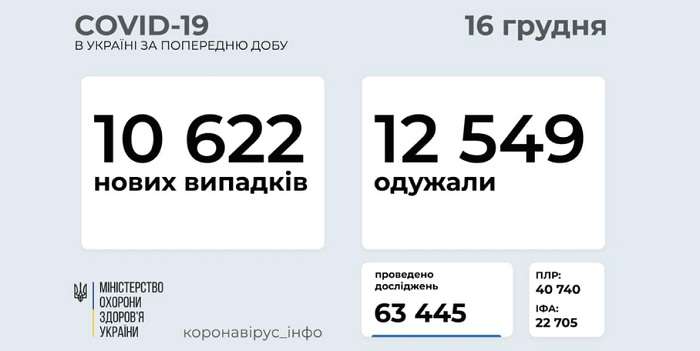 10 622 нових випадки коронавірусної хвороби COVID-19 зафіксовано в Україні станом на 16 грудня 2020 року. Зокрема,…