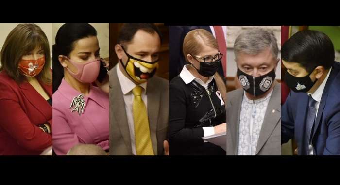 Оригинальные маски были замечены у Оксаны Дмитриевой, которая выбрала розовую маску под розовое платье. Спикер Дмитрий Разумков красуется маской с силуэтом здания ВРУ. У Петра Порошенко маска с вышивкой. Нардеп Максим Дырдин вообще выбрал для себя яркую желтую маску под цвет галстука.
