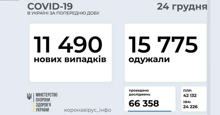 Сьогодні, 24 грудня, міністр МОЗ Максим Степанов повідомив, що за минулу добу кількість хворих на коронавірус збільшилась на 11 490 осіб. З них 488 дітей та 445 медпрацівників. До слова, за добу проведено 66 358 тестів на коронавірус.