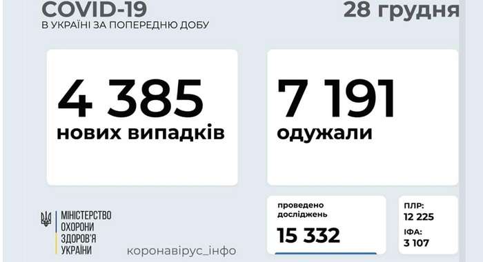 4 385 нових випадків коронавірусної хвороби COVID-19 зафіксовано в Україні станом на 28 грудня 2020 року. Зокрема,…
