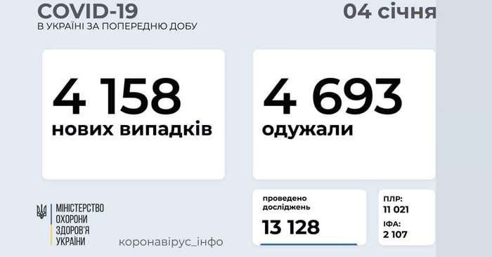 Сегодня, 4 января, глава Минздрава Максим Степанов сообщил, что в Украине за минувшие сутки обнаружили 4158 новых больных на COVID-19. Из них 170 детей и 163 медработника. К сожалению, 73 украинца, у которых обнаружили коронавирус, умерли.