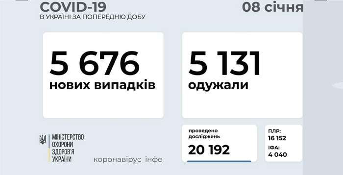 Сегодня, 8 января, стало известно, что за минувшие сутки в Украине зафиксировали 5676 новых случаев заболевания на коронавирус. Из них 166 детей и 179 медработников. 6 января было зафиксировано 8997 случаев заболевания.