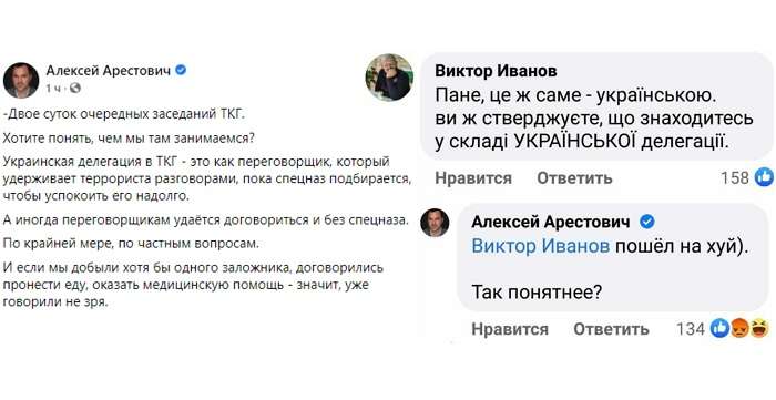 Представник української делегації в Тристоронній контактній групі (ТКГ) та радник керівника Офісу президента Олексій Арестович залишив на своїй сторінці у соцмережі пост про чергове засідання. Свій пост він написав російською мовою.