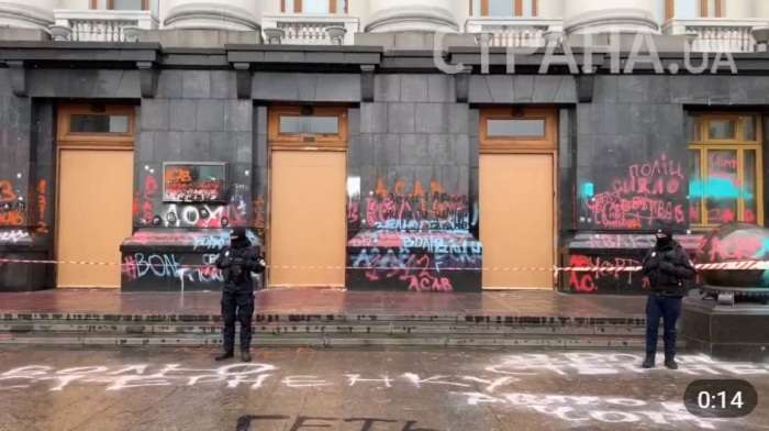 Українські журналісти повідомили, що Офіс президента у Києві все ще без центральних дверей. Також з фасаду будівлі не стерли написи. Станом на 22 березня замалювали лише свастику. Наразі біля будівлі фотографуються всі охочі. Перехожі називають її арт об’єктом .