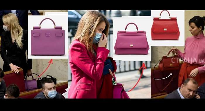 Народная избранница Ирина Аллахвердиева показала сумочку Dolce & Gabbana за €1900 или около 62 000 гривен. Ее коллега по партии «Слуга народа» Лиза Ясько тоже имеет сумочку Dolce & Gabbana за около €1725, или чуть больше 56 000 гривен. Такую же сумочку имеет нардеп Оксана Дмитриева, которая тоже представляет президентскую фракцию.