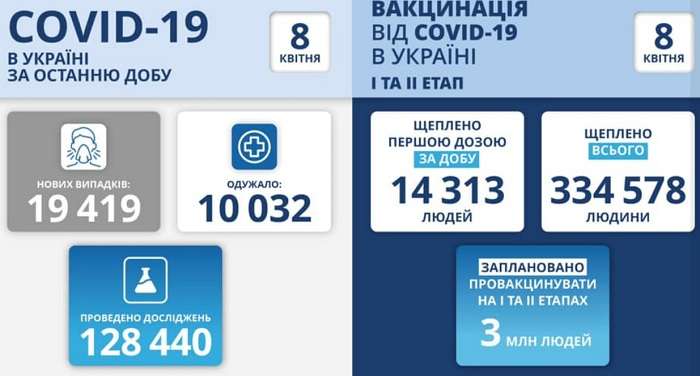 Сегодня, 8 апреля, глава Минздрава Максим Степанов сообщил, что за минувшие сутки в Украине 19419 новых случаев заболевания на COVID-19. Из них 766 детей и 480 медработников.