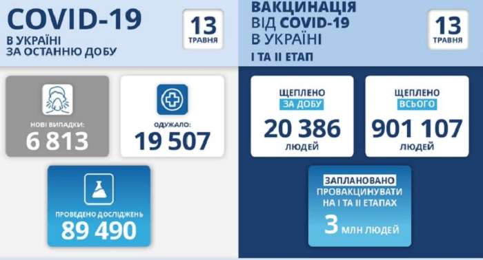 Сегодня, 13 мая, в пресс-службе Минздрава сообщили, что за минувшие сутки в Украине обнаружили 6813 человек, больных на коронавирус. Из них 289 детей и 160 медработника. Умерли за сутки 346 человек, а с начала пандемии 47333 пациентов.