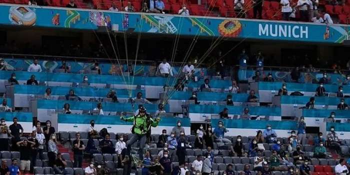 Сегодня, 16 июня, стало известно, что в Мюнхене перед матчем Евро-2020 Франция-Германия появился активист международной экологической организации «Гринпис». Он пролетел над болельщиками на парашюте, после этого приземлился на поле.