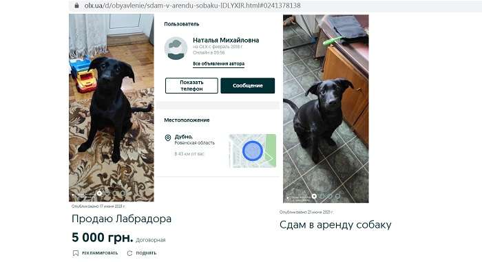 «Здам собаку в оренду для прогулянки, гри або просто для того, що б зрозуміти потрібна вам своя собака чи ні 🙂 Звуть Моллі, порода лабрадор, добра і грайлива, любить дітей. Знає команди: сидіти, лежати, стій, поруч. Є улюблена іграшка кільце, за яким любить бігати. Вартість 150 грн/год + заставна сума 3 000 грн, яка повернеться до вас після повернення вихованця. Якщо оренда вихованця 5 год і більше то сума оренди 100 грн/год», – відзначила жінка.