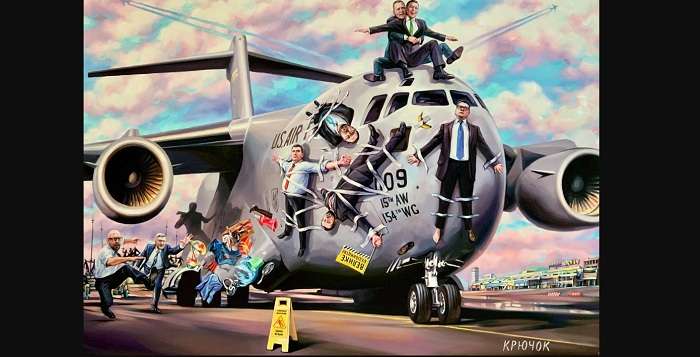 На картине изображен сюжет из недавних событий в Афганистане, когда люди цеплялись за американский самолет на фоне захвата страны талибами. Однако Крюкова изобразила у американского военного самолета представителей украинской власти – Владимира Зеленского и его подопечных. Также на картине можно увидеть политика Арсения Яценюка.
