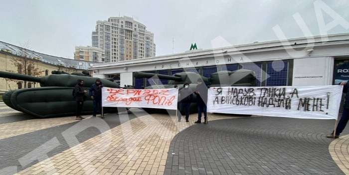 Сегодня, 16 декабря, стало известно, что в Киеве возле метро Арсенальная появились большие надувные танки. По словам предпринимателя Назара, это акция-перформанс. Так, мужчина утверждает, что он обманутый подрядчик, выполнявший заказ для одной из воинских частей в Николаевской области.