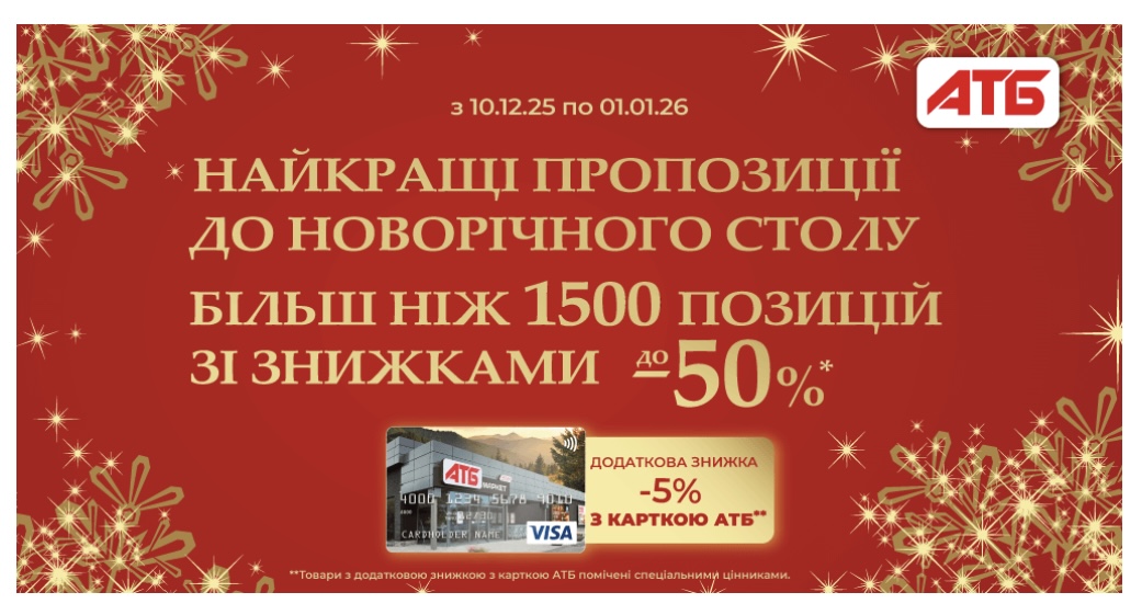 АТБ запустив акцію «Новорічні знижки», яка діє з 10 грудня 2025 року до 1 січня 2026 року і орієнтована на покупки до святкового столу та на щоденні потреби. У мережі заявляють понад 1500 позицій зі знижками до -50%. Додатково покупці можуть отримати -5% з карткою АТБ, що особливо відчутно при великих закупах перед Новим роком, повідомляє Преса України.