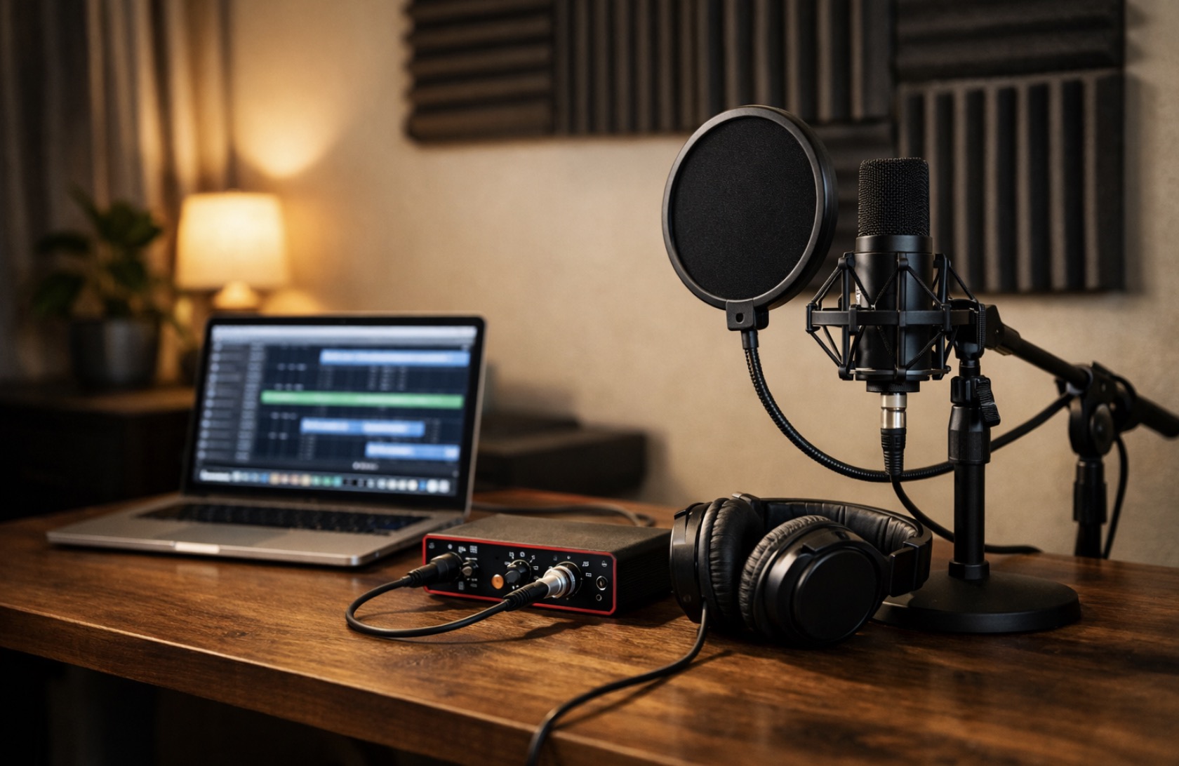 Щоб зрозуміти, що потрібно для звукозапису, мисліть ланцюжком. Для вокалу або акустичних інструментів ключовими є мікрофон і передпідсилення. Для електрогітари — ще й DI/ампсимуляція. Для подкасту — стабільність рівня, мінімум кімнатних відбиттів і зручний моніторинг. У будь-якому випадку вам потрібні: джерело сигналу (голос/інструмент), перетворювач (мікрофон або лінійний вхід), аудіоінтерфейс, комп’ютер із DAW та система моніторингу.