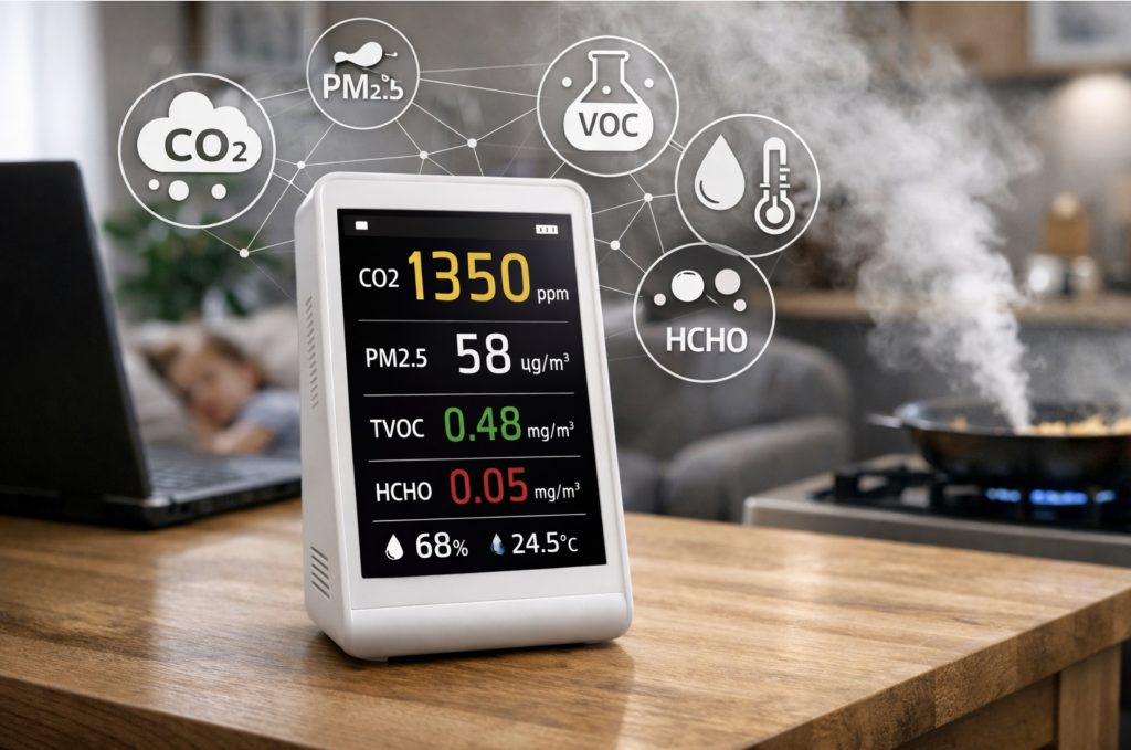 Современный датчик качества воздуха может показывать несколько показателей, и каждый из них отвечает за свой «кусок» картины. Самый популярный параметр — концентрация CO2: она растёт в закрытых помещениях из-за дыхания людей, и часто именно она объясняет сонливость и снижение внимания. Показатель мелкодисперсной пыли обычно представлен фракциями PM1, PM2.5 и PM10, которые увеличиваются при готовке, уборке, активном движении, а также могут приходить с улицы. Некоторые модели дополнительно показывают летучие органические соединения — летучие органические соединения (TVOC), которые связаны с испарениями бытовой химии, мебели, отделочных материалов и косметики. Отдельные устройства измеряют формальдегид (HCHO), но важно помнить, что точность таких сенсоров сильно зависит от класса прибора и условий. Наконец, почти всегда присутствуют влажность и температура в помещении, которые влияют на ощущение комфорта и риски образования конденсата и плесени.
