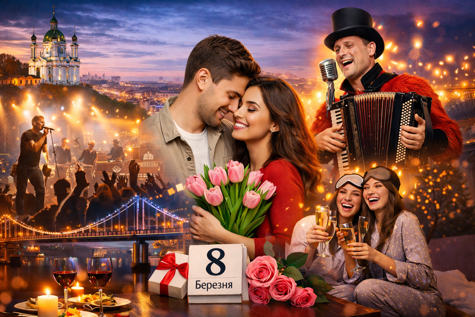 Київ пропонує безліч варіантів, як провести 8 березня — від масштабних концертів до затишних вечерь та романтичних прогулянок містом. Завдяки великому вибору подій кожен може знайти формат святкування, який найбільше відповідає настрою та бажанням.